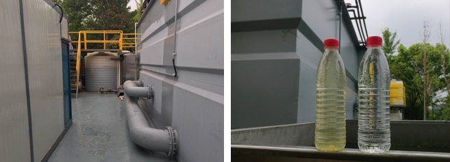十号河位于杭州市江干区,北起余杭区界,向南流入和睦港,全长1762米,河面宽度5-100米,平均水深约2.3米,河道水体容量约10万立方。2015年,该河道已进行了生态治理和养护工程,目前河道水体中藻类较多,水质总磷超标,属于劣五类水,且水体颜色呈“棕绿色”,水面有大量的水绵等漂浮物,严重影响河道的生态景观效果。 该项目采用了一套5000吨/天的KtLM滤膜一体机进行河道水质提升,出水达到Ⅳ类水标准。