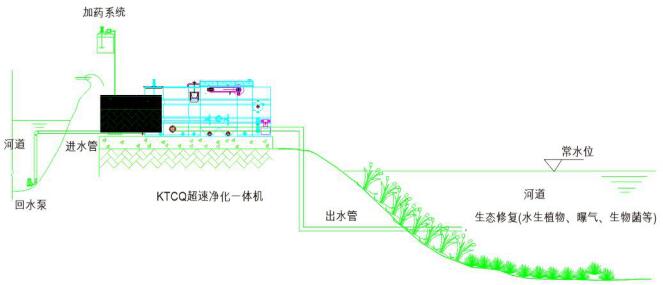 基于高效复合絮凝水体物理处理技术,表面负荷达到30m3/m2·h,具有除磷脱氮技术。处理水量大,设备占地小、可移动,是一种快速物化处理技术,解决大流量污水入河问题。用于大水量的雨污混流排放口及河道水循环快速处理。主要指标SS去除90%以上,COD、TP去除60%及部分氨氮,是当下消劣利器。
