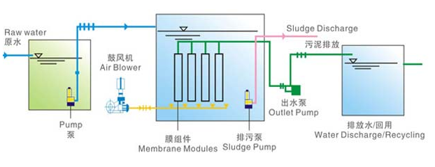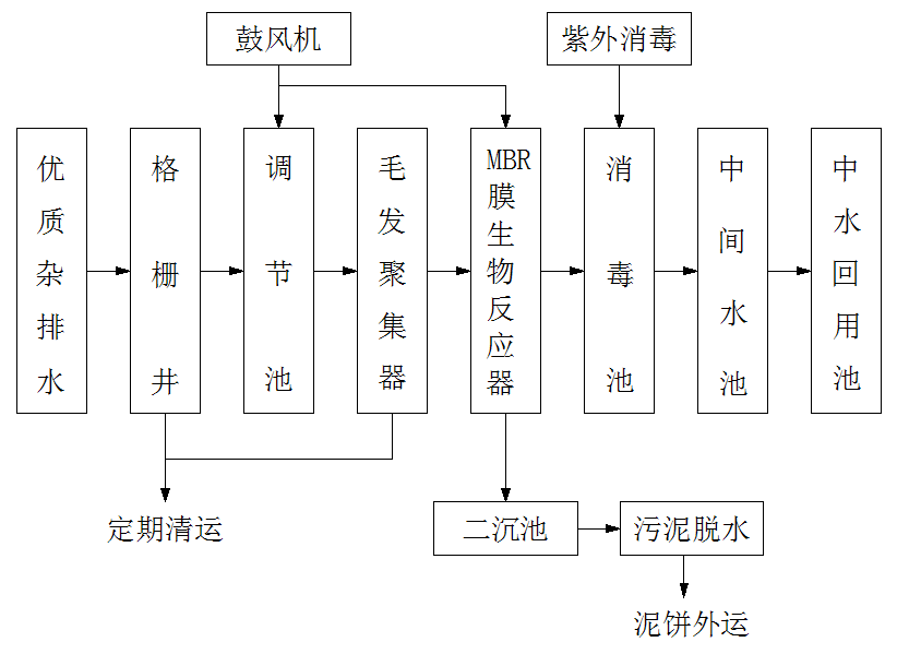 本项目为商业中心中水回用项目,回用水用于冲厕。中水的来源为洗涤,沐浴,厨房等优质杂排水,根据进水水质分析,优质杂排水可生化性好,宜采用生化处理。同时,因业主提供的处理设备安放场地有限,因此可选择占地面积较小的生化处理结合膜生物反应器工艺,故确定处理工艺为:格栅→调节池→生化处理→膜处理→消毒→回用。