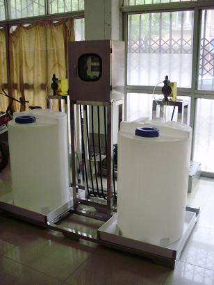 银江自动加药装置时以一个专用中央控制器为核心,并配置1-3只药桶、搅拌器、液位器、计量泵、检测探头、电磁阀及其他外部信号输出设备等构成。以循环冷却水的电导率只为检测对象,通过测定循环水的电导率值来衡量水质质量,发出加药、排污信号,并通过外部设备完成加药、排污,从而实现系统的自动运行,在实现杀菌灭藻、阻垢、缓蚀的同时保持水体一定的浓缩倍数。主机及主要部件均采用原装进口产品。