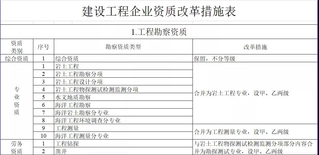 1.工程勘察资质。保留综合资质;将4类专业资质及劳务资质整合为岩土工程、工程测量、勘探测试等3类专业资质。综合资质不分等级,专业资质等级压减为甲、乙两级。