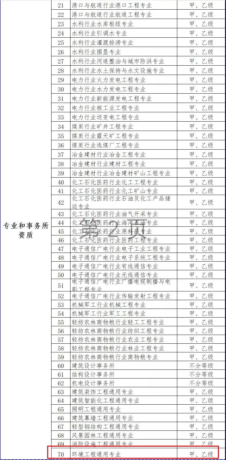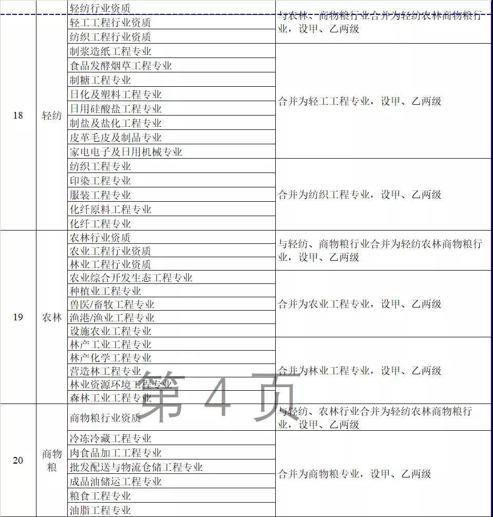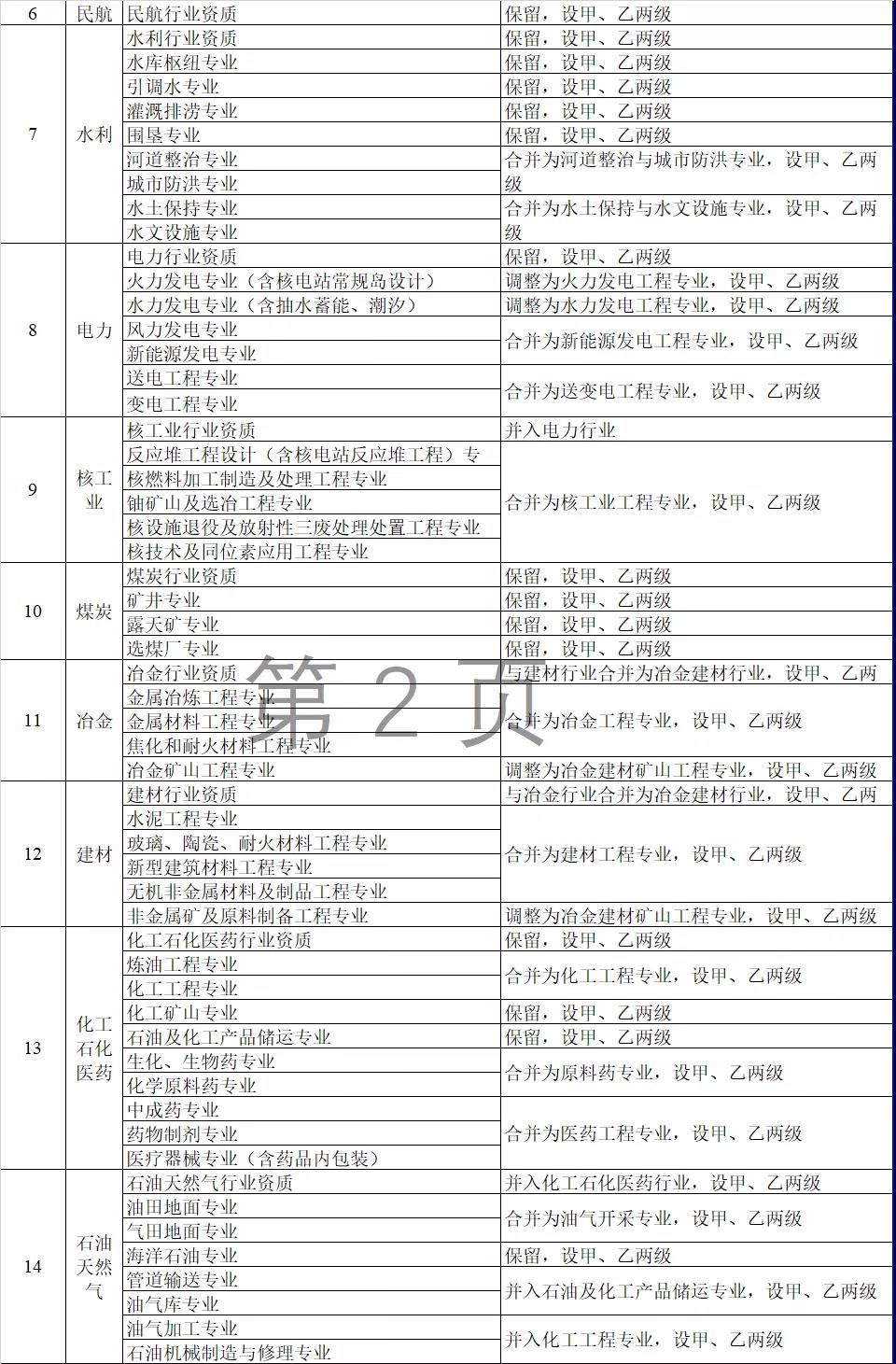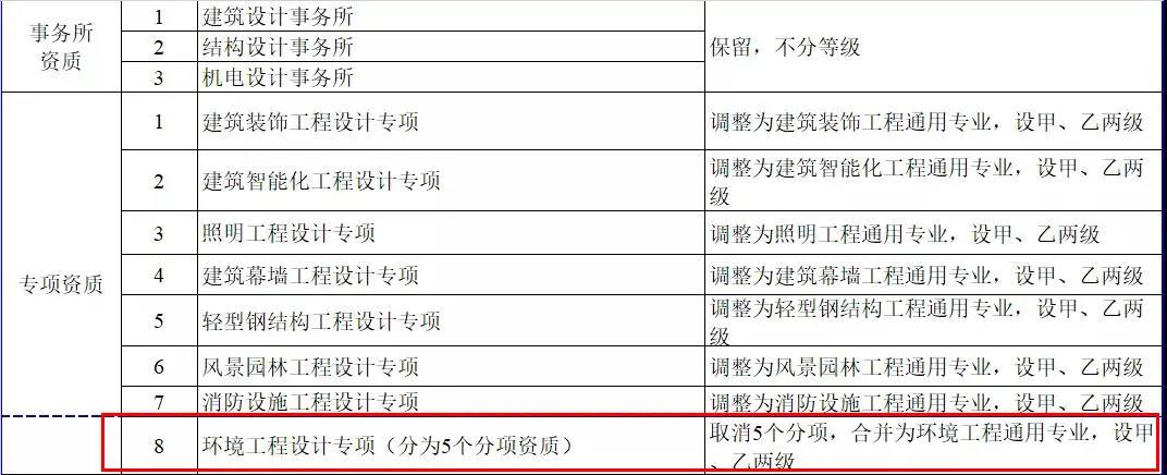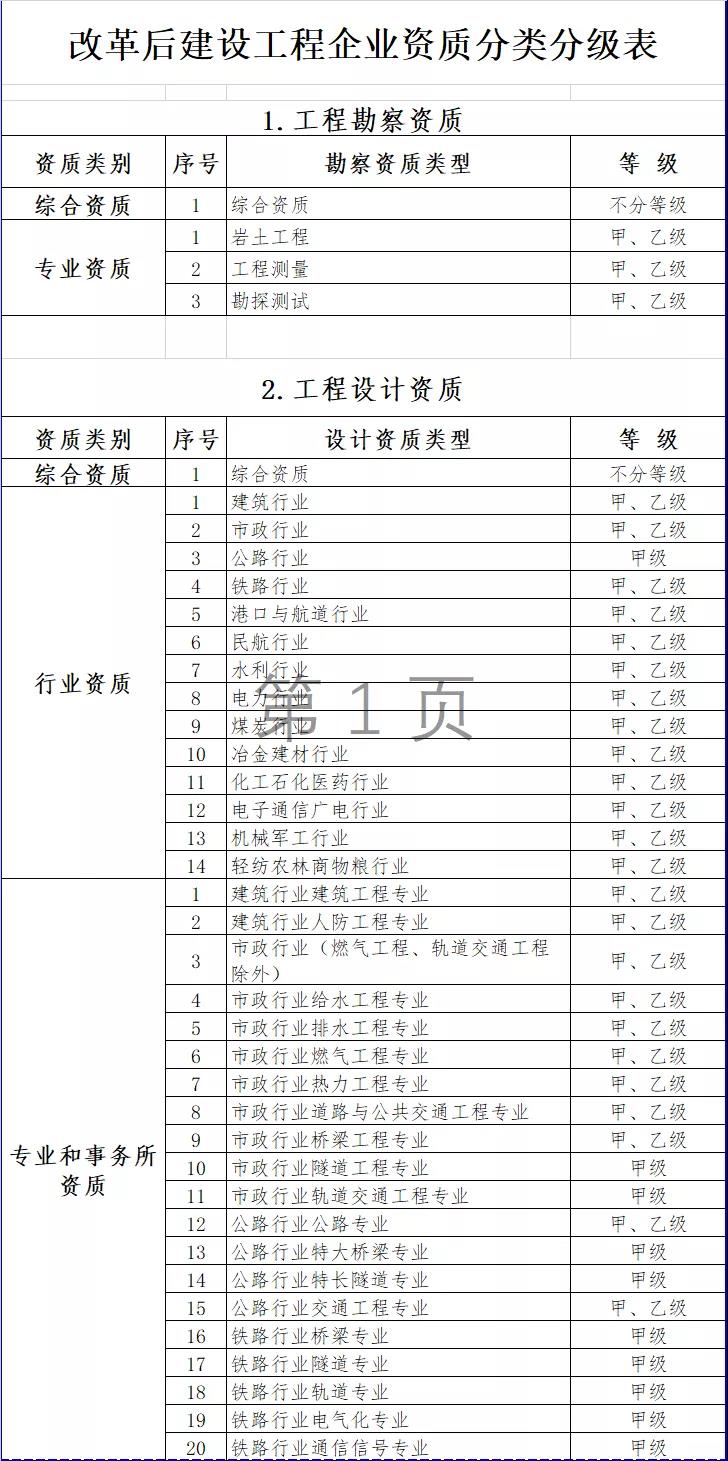 2.工程设计资质。保留综合资质;将21类行业资质整合为14类行业资质;将151类专业资质、8类专项资质、3类事务所资质整合为70类专业和事务所资质。综合资质、事务所资质不分等级;行业资质、专业资质等级原则上压减为甲、乙两级(部分资质只设甲级)。