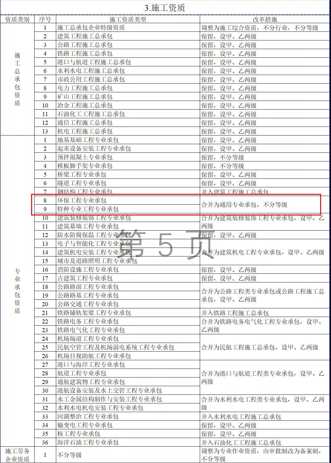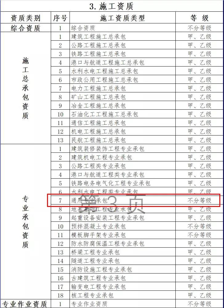 3.施工资质。将10类施工总承包企业特级资质调整为施工综合资质,可承担各行业、各等级施工总承包业务;保留12类施工总承包资质,将民航工程的专业承包资质整合为施工总承包资质;将36类专业承包资质整合为18类;将施工劳务企业资质改为专业作业资质,由审批制改为备案制。综合资质和专业作业资质不分等级;施工总承包资质、专业承包资质等级原则上压减为甲、乙两级(部分专业承包资质不分等级),其中,施工总承包甲级资质在本行业内承揽业务规模不受限制。