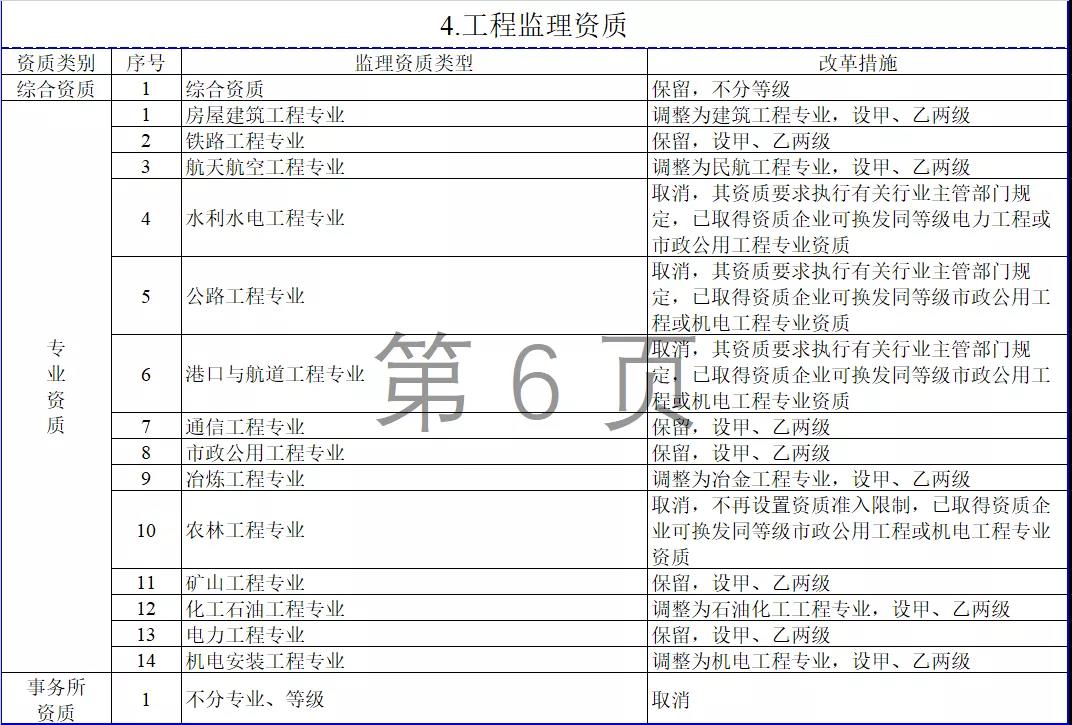 4.工程监理资质。保留综合资质;取消专业资质中的水利水电工程、公路工程、港口与航道工程、农林工程资质,保留其余10类专业资质;取消事务所资质。综合资质不分等级,专业资质等级压减为甲、乙两级。
