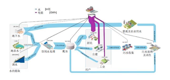 水与能互相关联,互为条件,相互依存。世界的能源安全高度依赖于水资源的供应,因为几乎所有的能源生产技术,如核能、热电、水力发电,都需要消耗大量的水;水的社会循环过程,从自然环境(地表、地下)的提取、处理、分配及使用、污水处理及回用都需要消耗大量的能源,同时水的 “包容性”又使其蕴含了丰富的可以回收的资源和能源,因此“水”与“能”往往相伴相生。据统计,水系统能耗及GHG排放是城镇总电能消耗量及GHG排放量的重要来源,根据美国EPA统计数据,水系统用电量占全社会用电的3%~4%;美国城镇水务板块GHG排放贡献率占全社会GHG的5%,这个指标在英国则更高。现代城市水系统架构下的“水-能”关系赋予了未来城镇水系统规划崭新的视角和维度,“双碳”背景下统筹“水-能关系”来系统构建城镇水系统尤其是排水系统规划将更具现实意义。