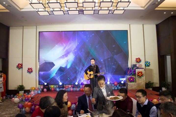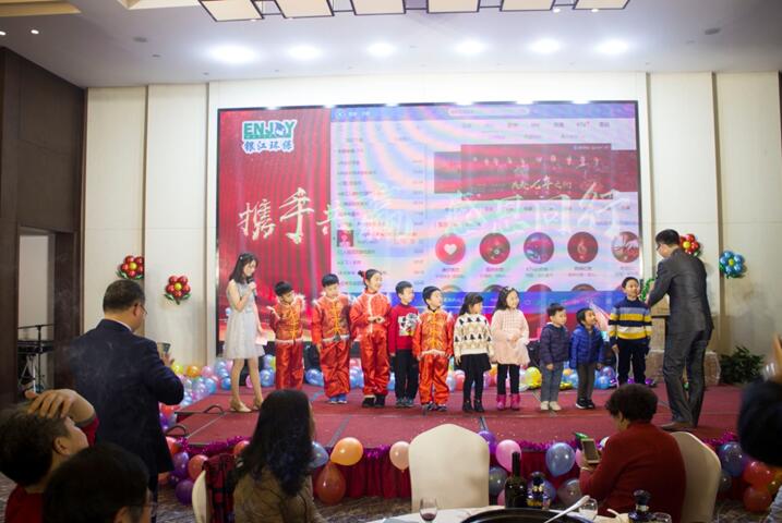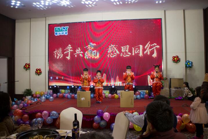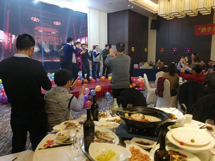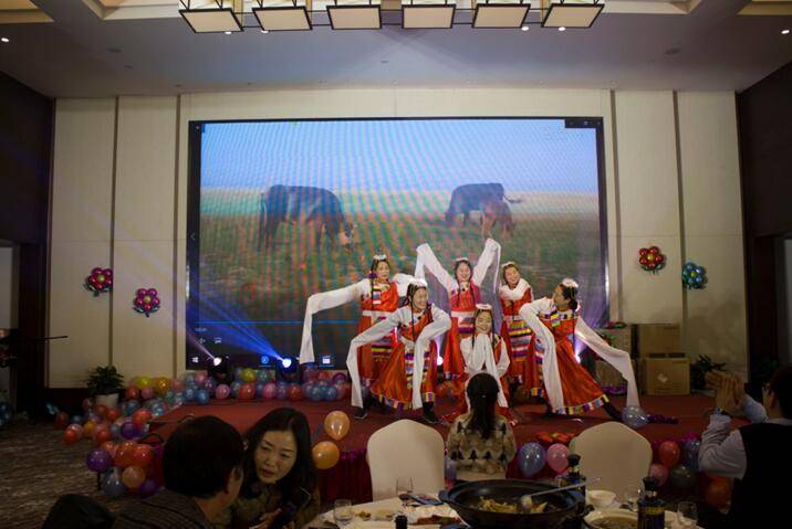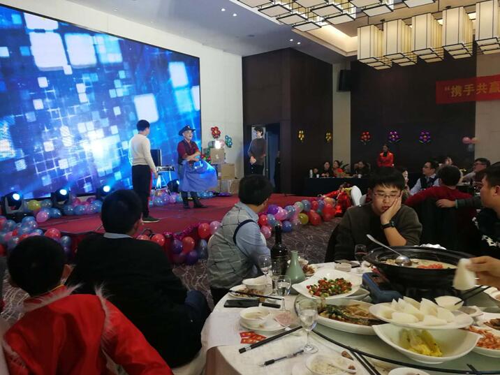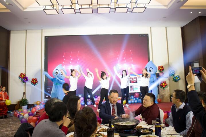 晚餐和文艺节目同时进行,舞蹈《C哩C哩》拉开晚会序幕,银江吉祥宝宝如意也闪亮登场。随后,歌曲、弹唱、藏舞、合唱、三句半、魔术、游戏、抽奖、优秀员工颁奖等穿插进行。