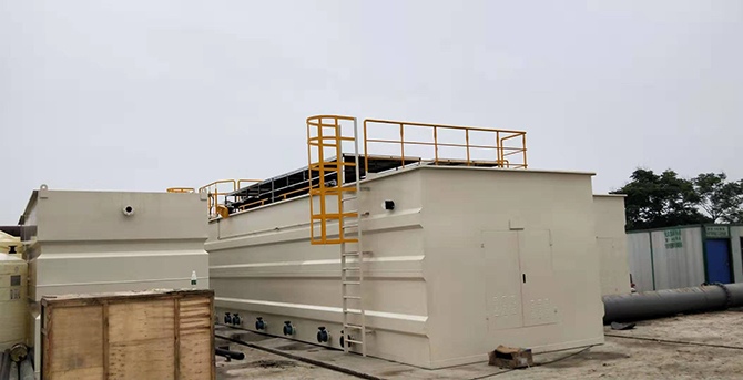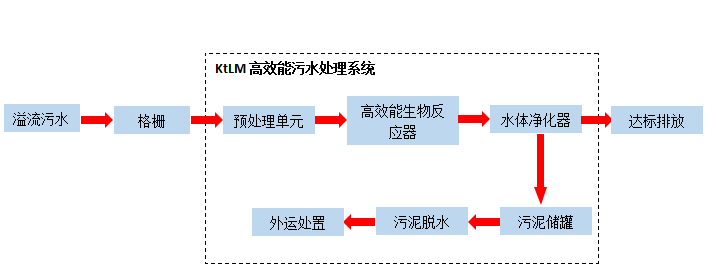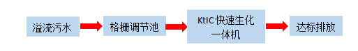 溢流生活污水经格栅调节池后进入KtIC快速生化一体机进行处理。设备内部设置缺氧区、兼氧区、好氧区、泥水分离、消毒,经处理后的污水达标排放。