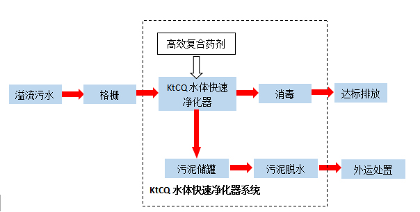 溢流污水经提升泵进入KtCQ水体快速净化器前段的配水槽,污水流经配水槽时与高效复合药剂混合进入搅拌反应池,反应絮体聚合为大的矾花,并利用絮体层流分流技术,形成二次絮凝反应,提高分离效率。再通过设备底部斜板沉淀进行泥水分离,同时通入微纳米气体,将水中剩余的的悬浮物或油浮出水面,从而达到双重固液分离之目的,污水经消毒后,达标排放,污泥浮渣进入污泥槽,经污泥泵送至污泥脱水设备处理。