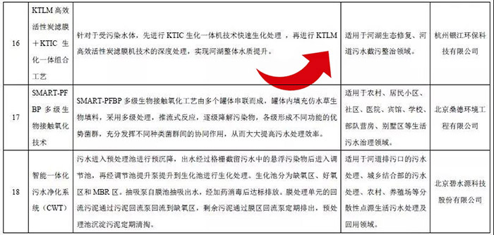 技术目录显示,来自北控水务的城镇排水系统智慧运营管控平台,北排集团城市污水好氧高密度微生物颗粒技术和基于厌氧氨氧化功能菌群优化的污水处理新技术,桑德环境的SMART-PFBP 多级生物接触氧化技术,碧水源的“MBR-DF”双膜技术和智能一体化污水净化系统(CWT),幸运彩的KtLM+KtIC一体化组合工艺等21项水污染防治技术位列其中。