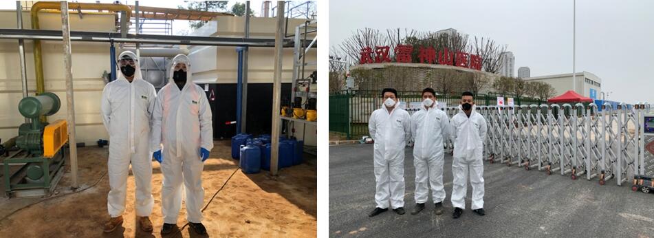 付宇:我和王立军30号凌晨2点到武汉,休息了大概5个小时直接到雷神山施工现场。到了现场以后看到施工现场几千人只为同一个目标努力完成工作真的很震撼。因为8号整个医院就要移交收治病人,所以给我们的时间最多只有7天,一周内需要完成污水站的安装工作并且将所有设备的调试正常,因此我们的计划安排需要精确到以小时计,每一个小时计划完成什么事,每一项工作哪天几点完成,完成每一项工作需要多少工人,当天都需要完成什么工作都要明确。趁每次吃饭的时间,几个人还要和施工负责人梳理目前工作任务,再确定接下来的工作安排。几个同事都是连着几天在施工现场,累了只在工地车上睡一下。通过公司各部门同事共同努力,6号整个安装工作完成。调试阶段的问题大家一起想办法,方明也从火神山赶过来支援,终于在7号把整个系统调试正常。