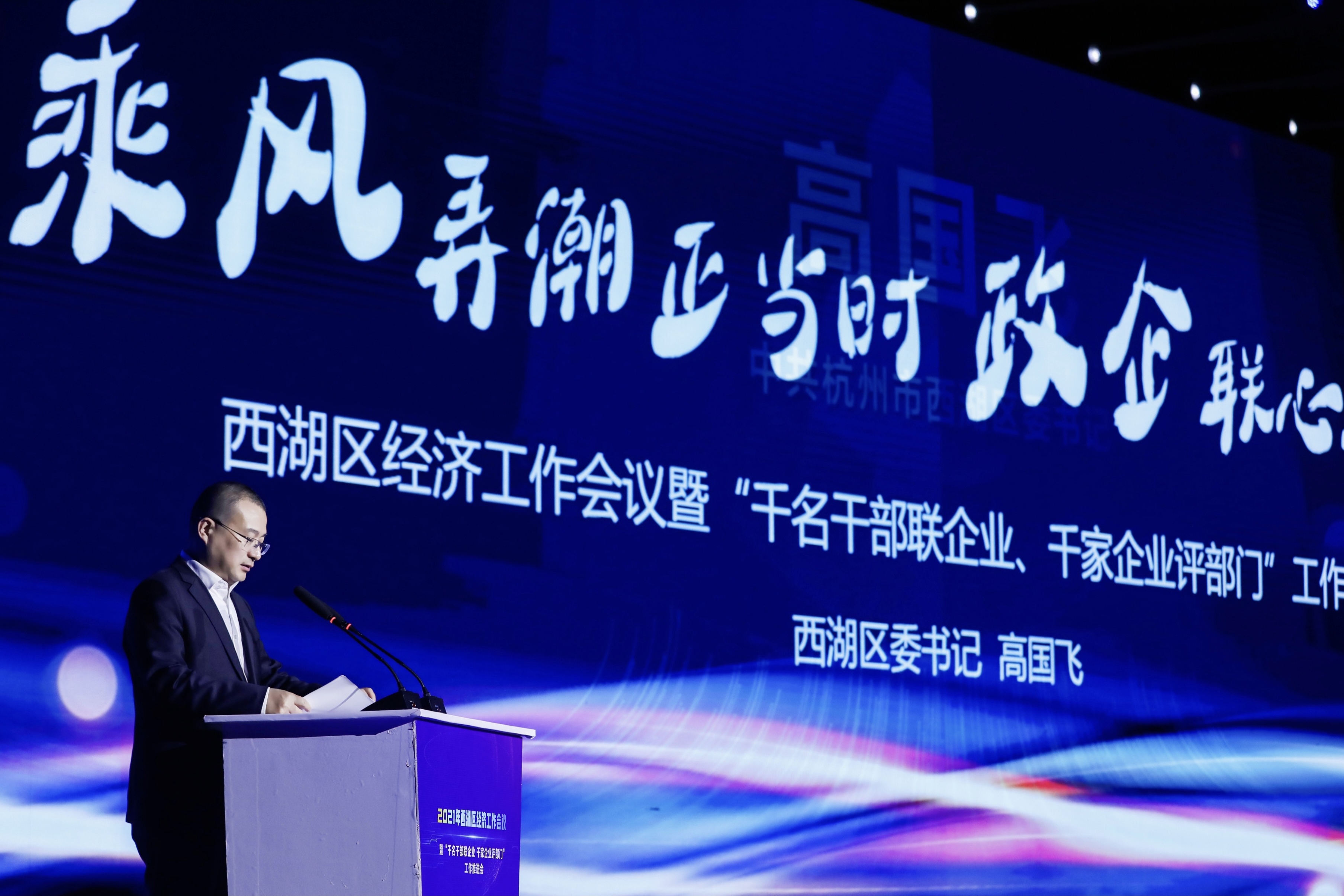 2021年西湖区经济工作会议暨“千名干部联企业、千家企业评部门”工作推进会在云栖小镇国际会展中心一期二楼云栖厅召开。会议由区委副书记、区长董毓民主持,全区各单位和联企干部以及双千企业主要负责人参加。