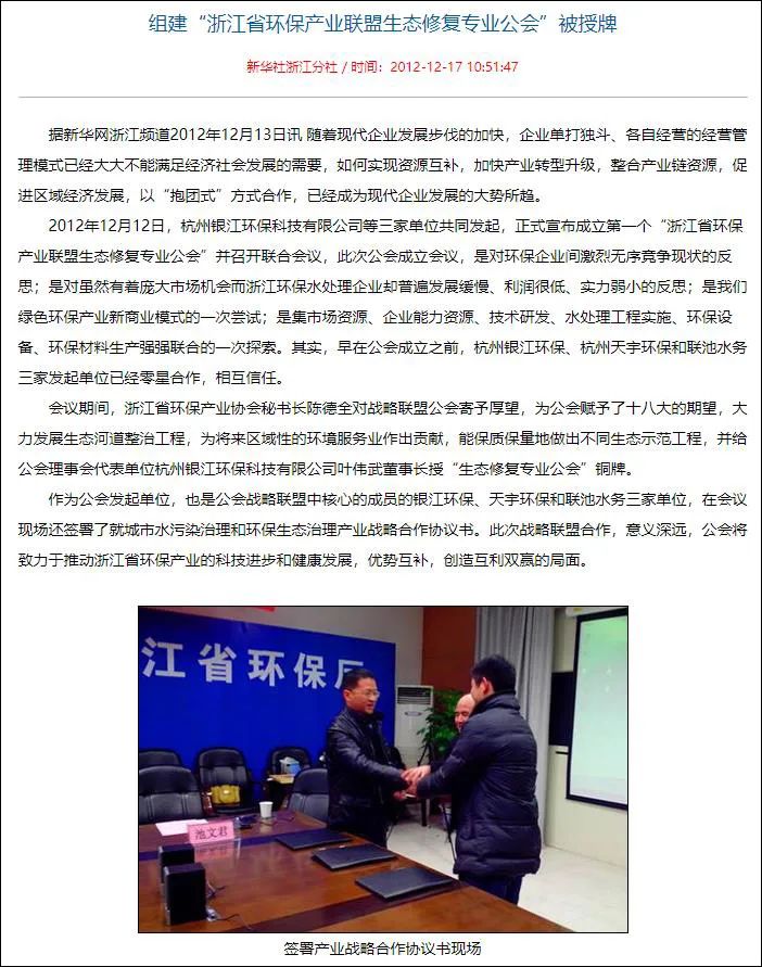 浙江省环保产业联盟生态修复公会于2012年12月12日由幸运彩、天宇环保和联池水务三家单位共同发起成立。